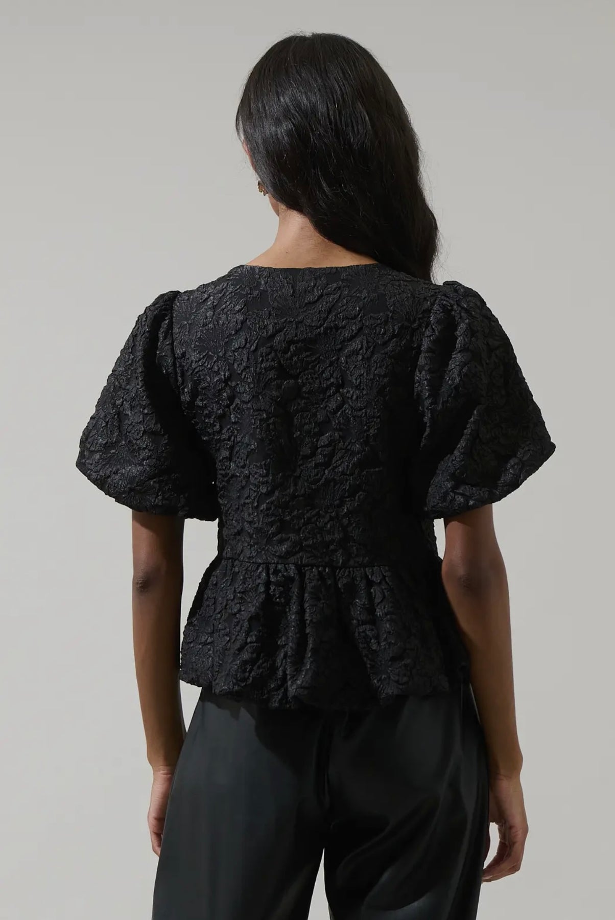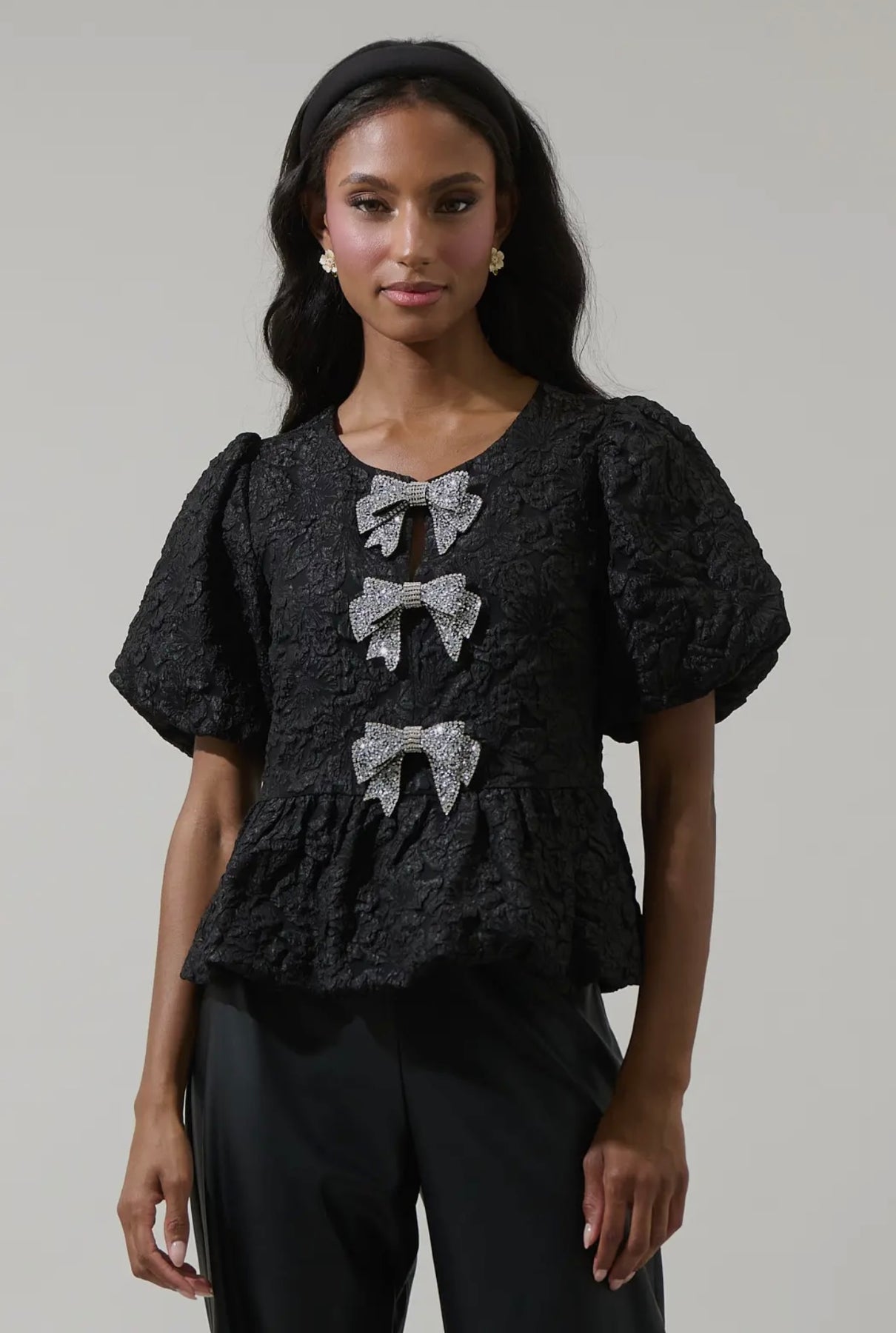 All eyes on you in this unforgettable top. Designed in textured jacquard, it features three sparkling rhinestone bows down the front, voluminous bubble sleeves, and comes in two rich hues. Classic black and burgundy. Pair it with high-waisted trousers and a mini bag for a glam night-out look.