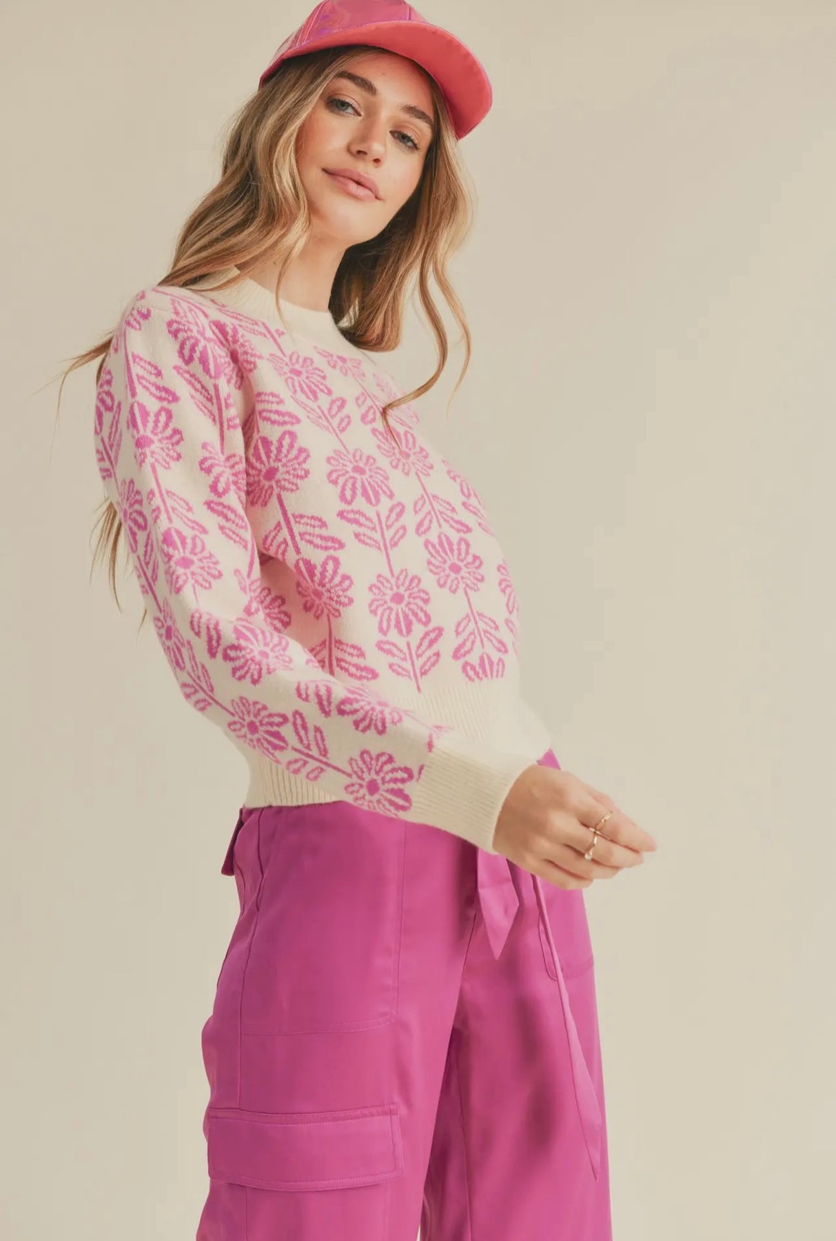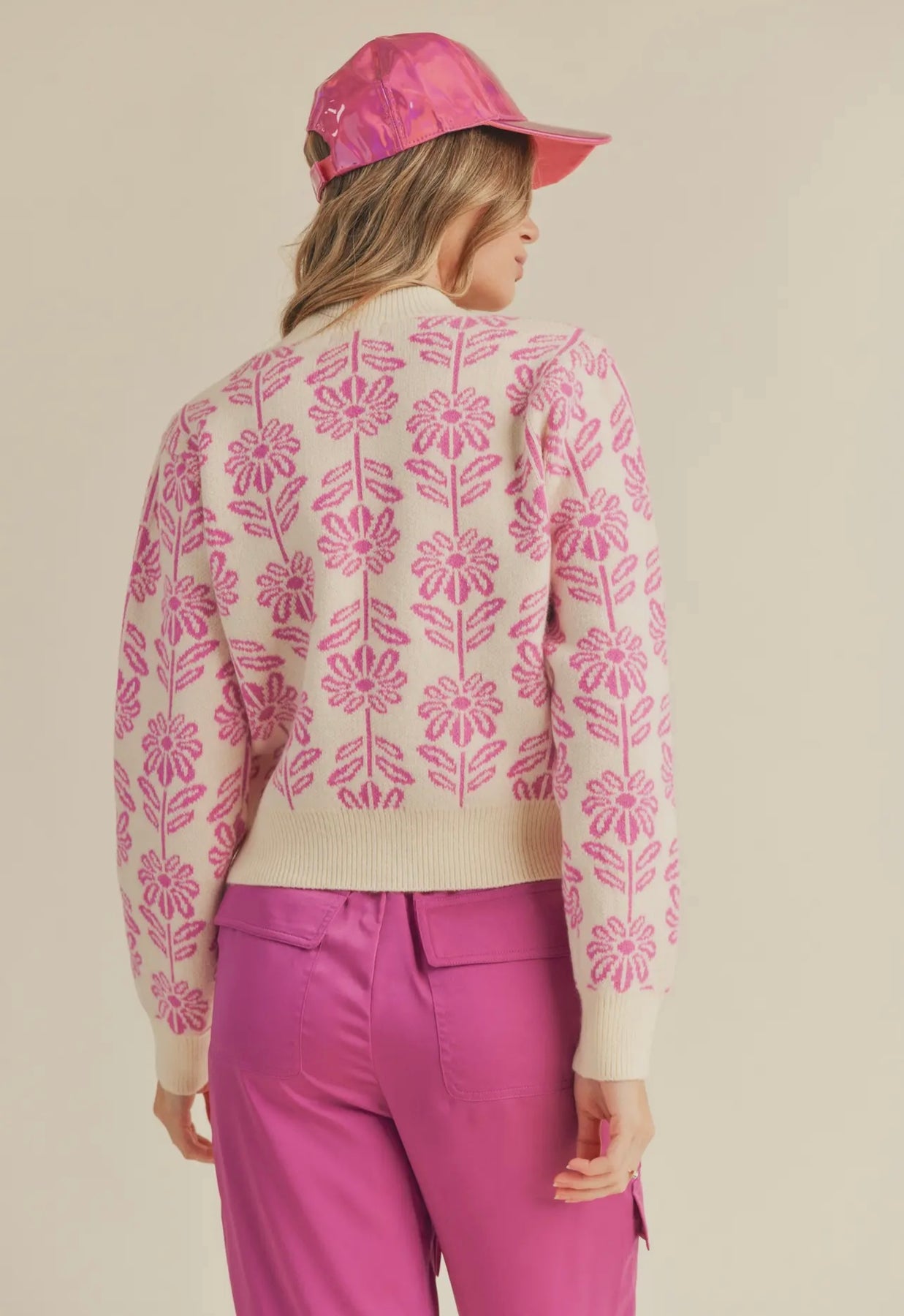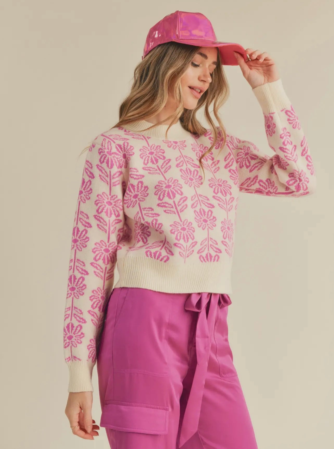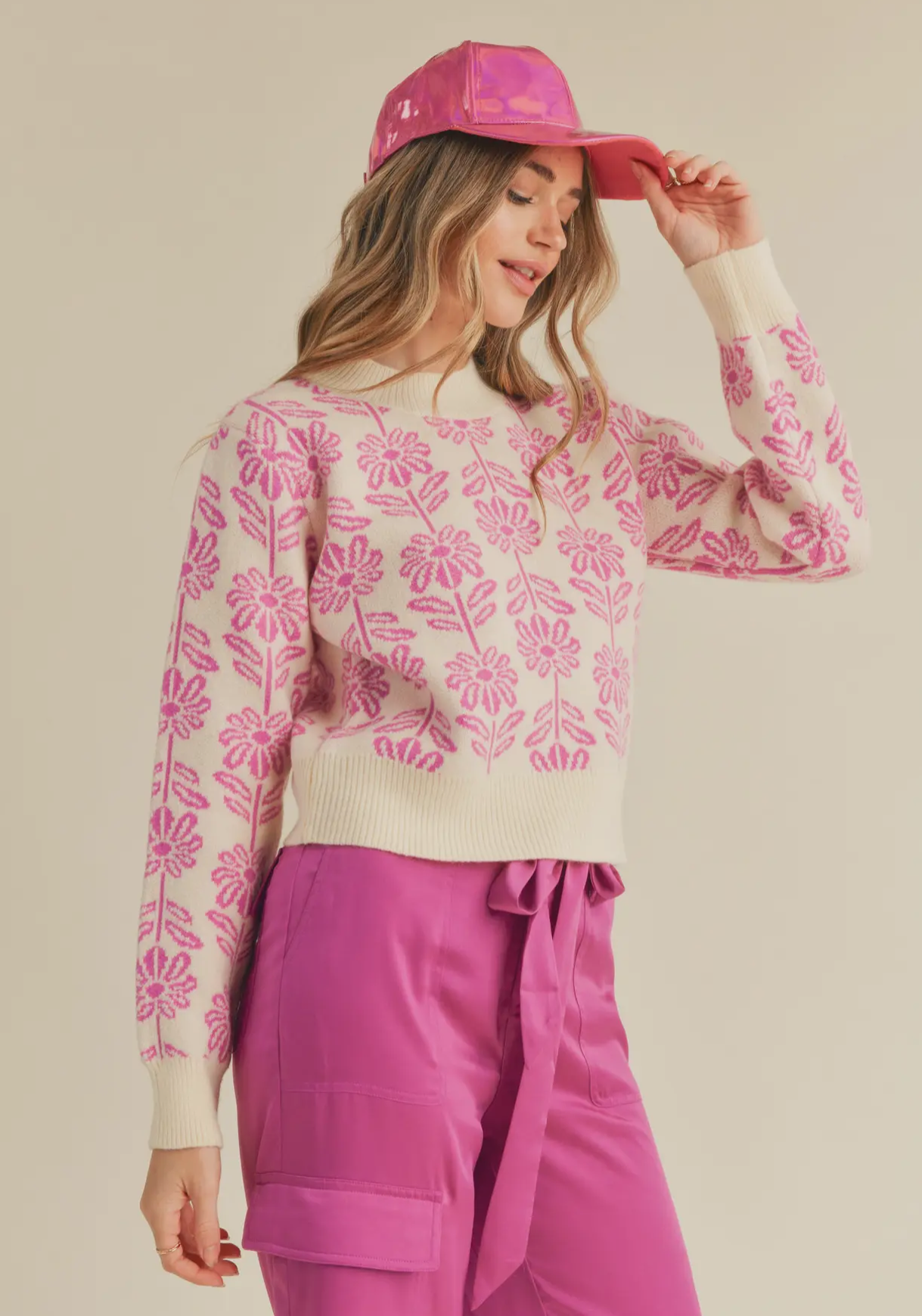Get dressed for fun times in this floral pattern knit sweater! Cozy knit shapes this sweater with a high rounded neckline, long sleeves, and a waist length bodice.