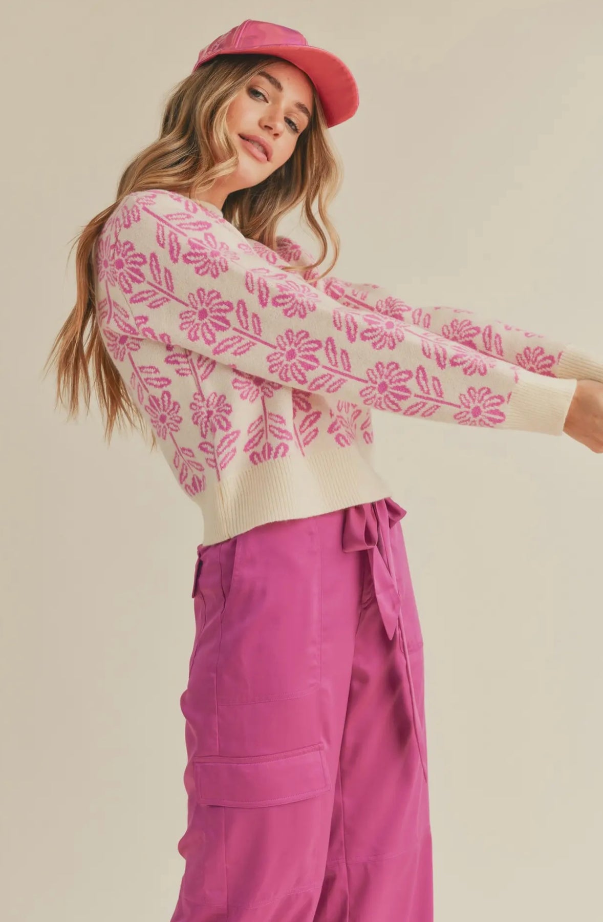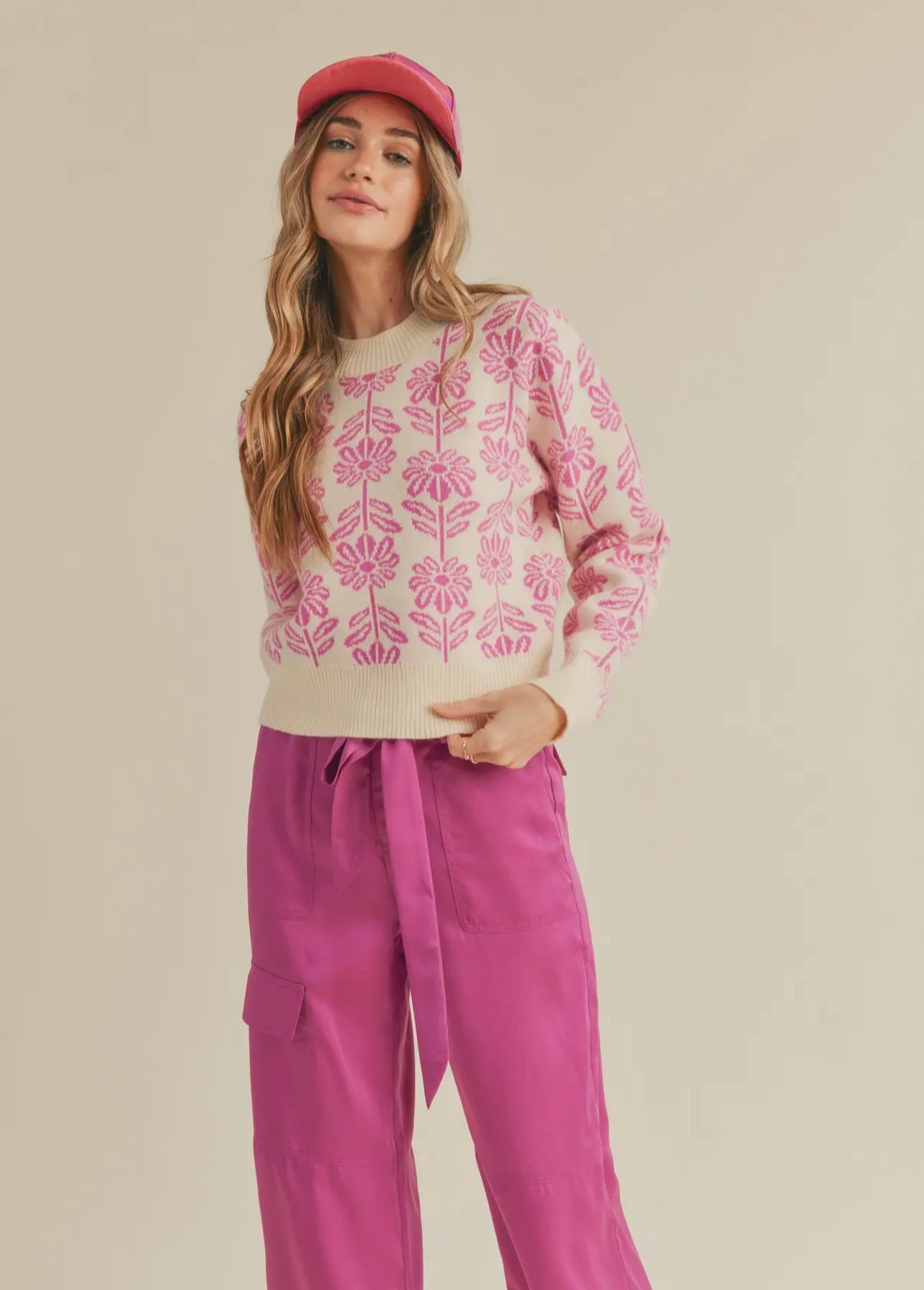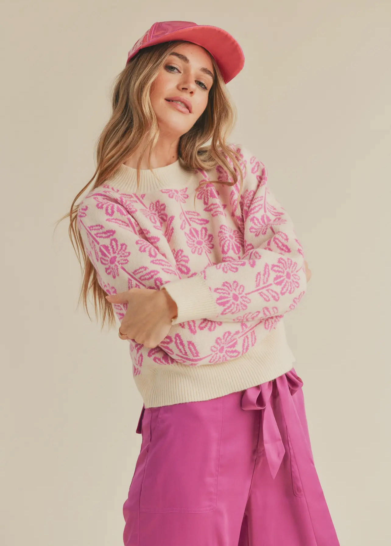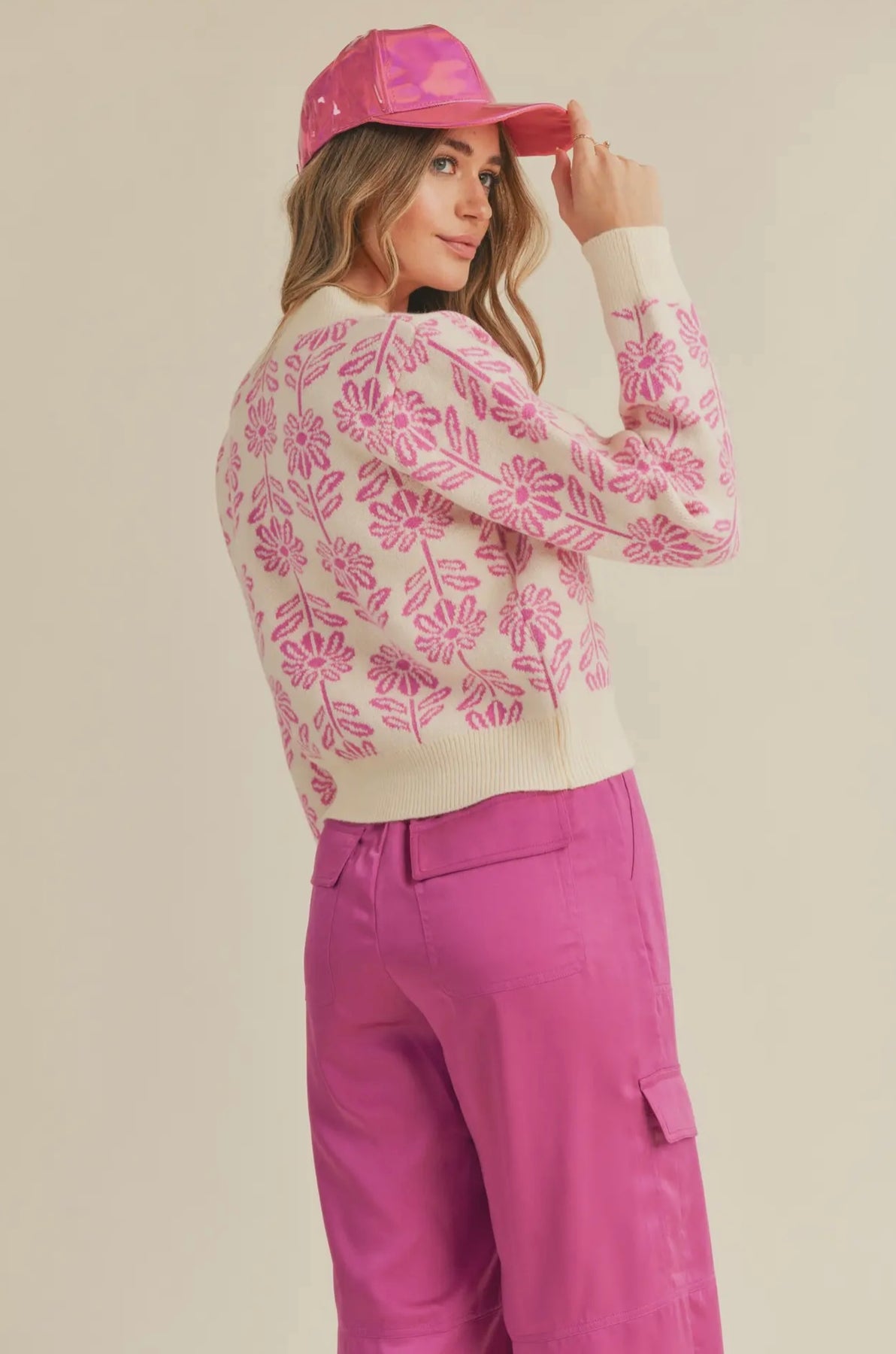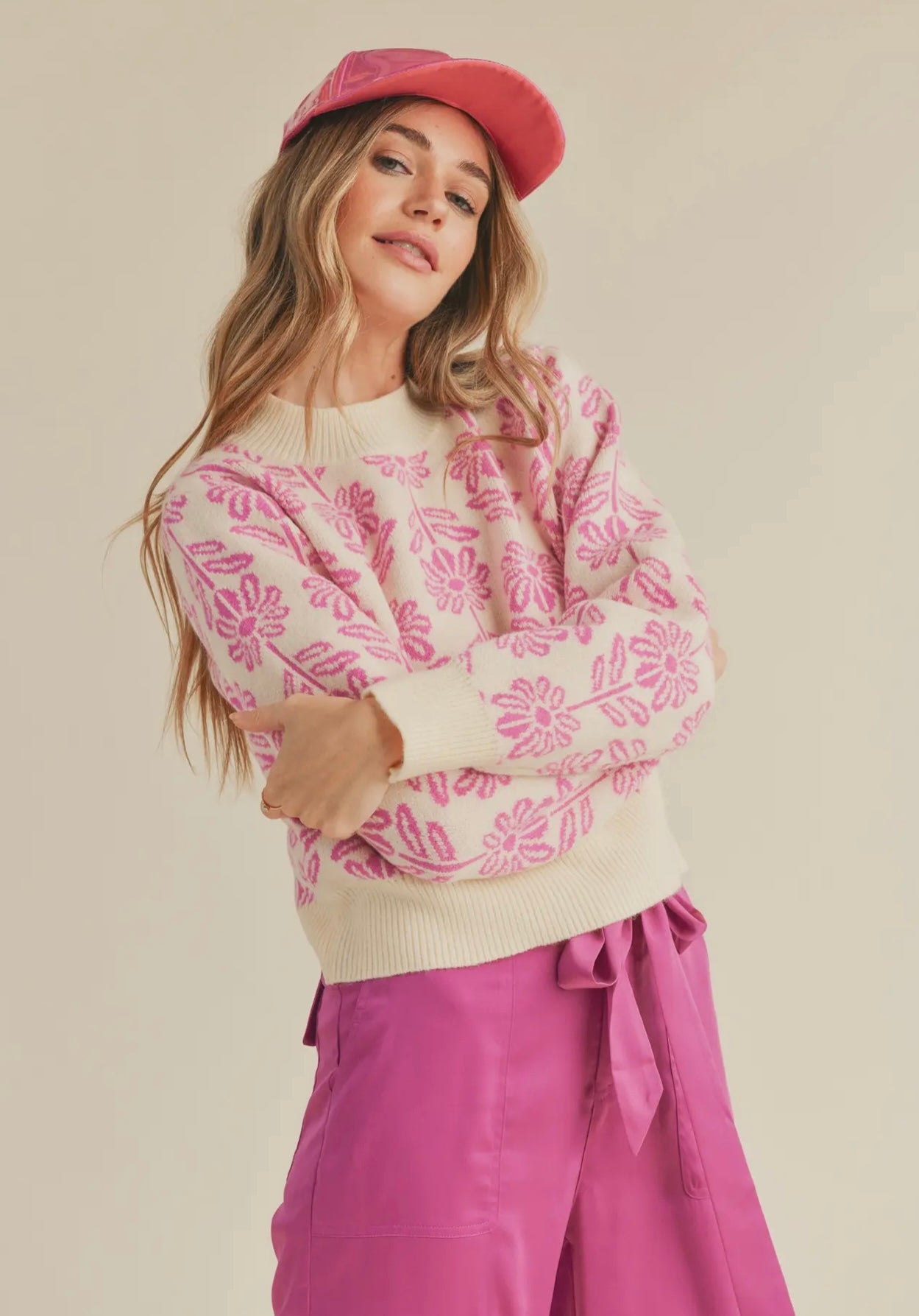 Get dressed for fun times in this floral pattern knit sweater! Cozy knit shapes this sweater with a high rounded neckline, long sleeves, and a waist length bodice.