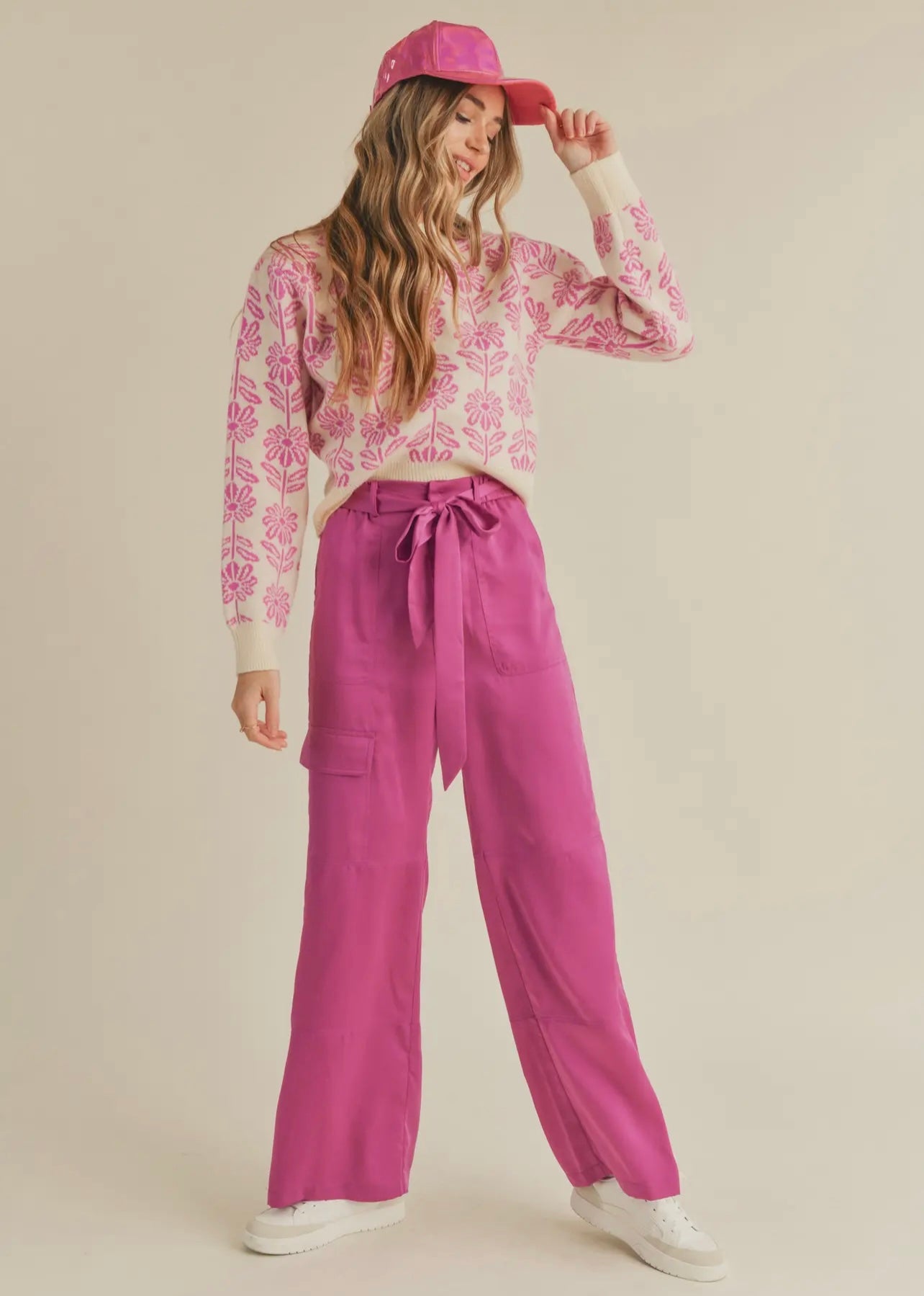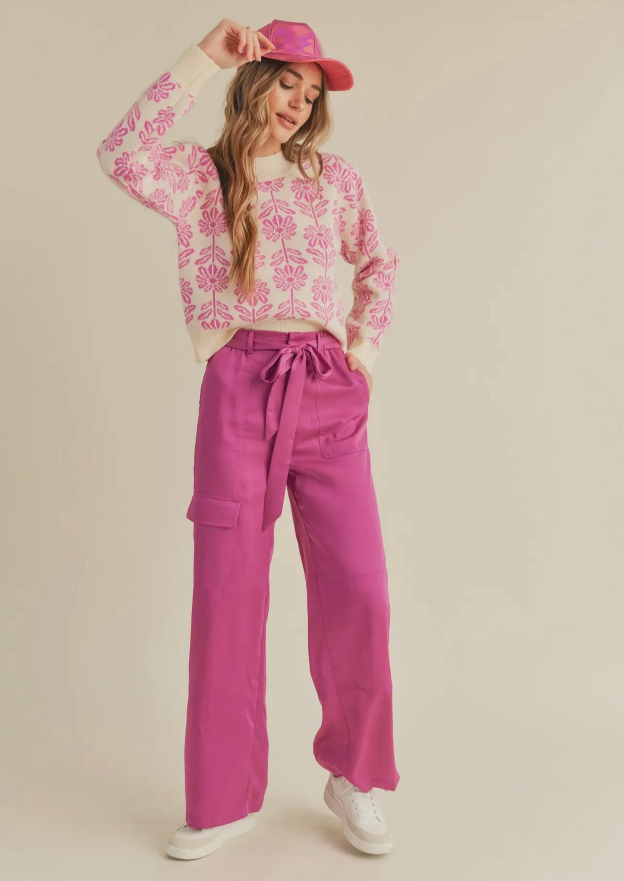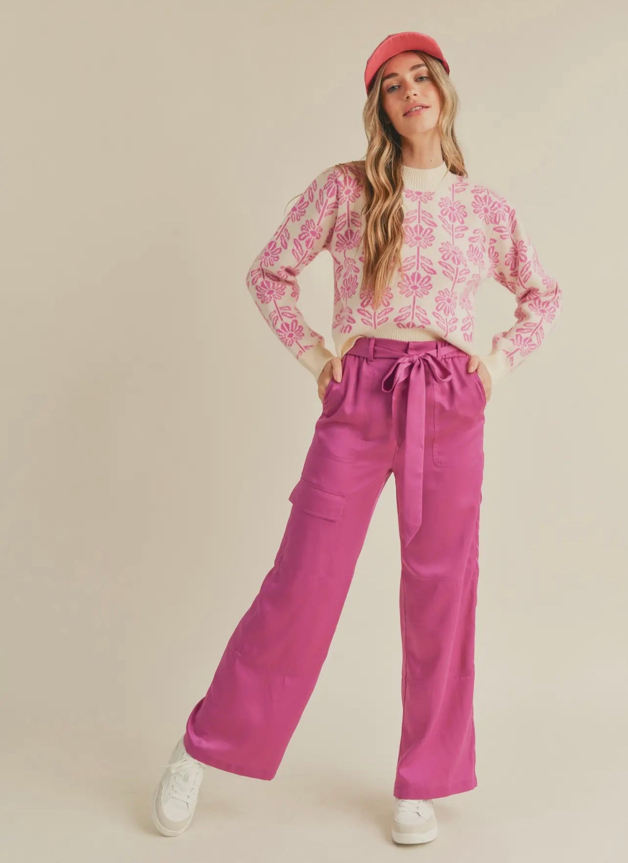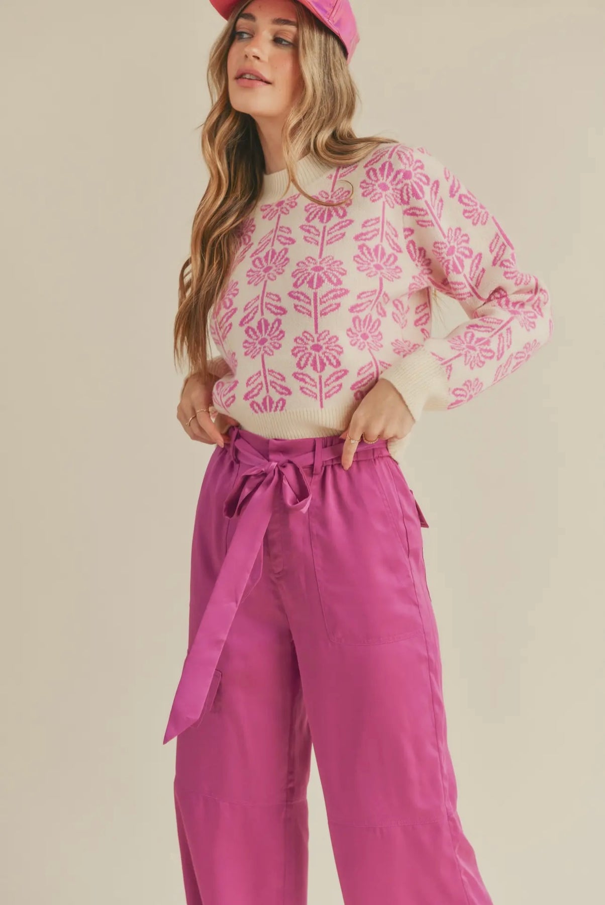 Get dressed for fun times in this floral pattern knit sweater! Cozy knit shapes this sweater with a high rounded neckline, long sleeves, and a waist length bodice.