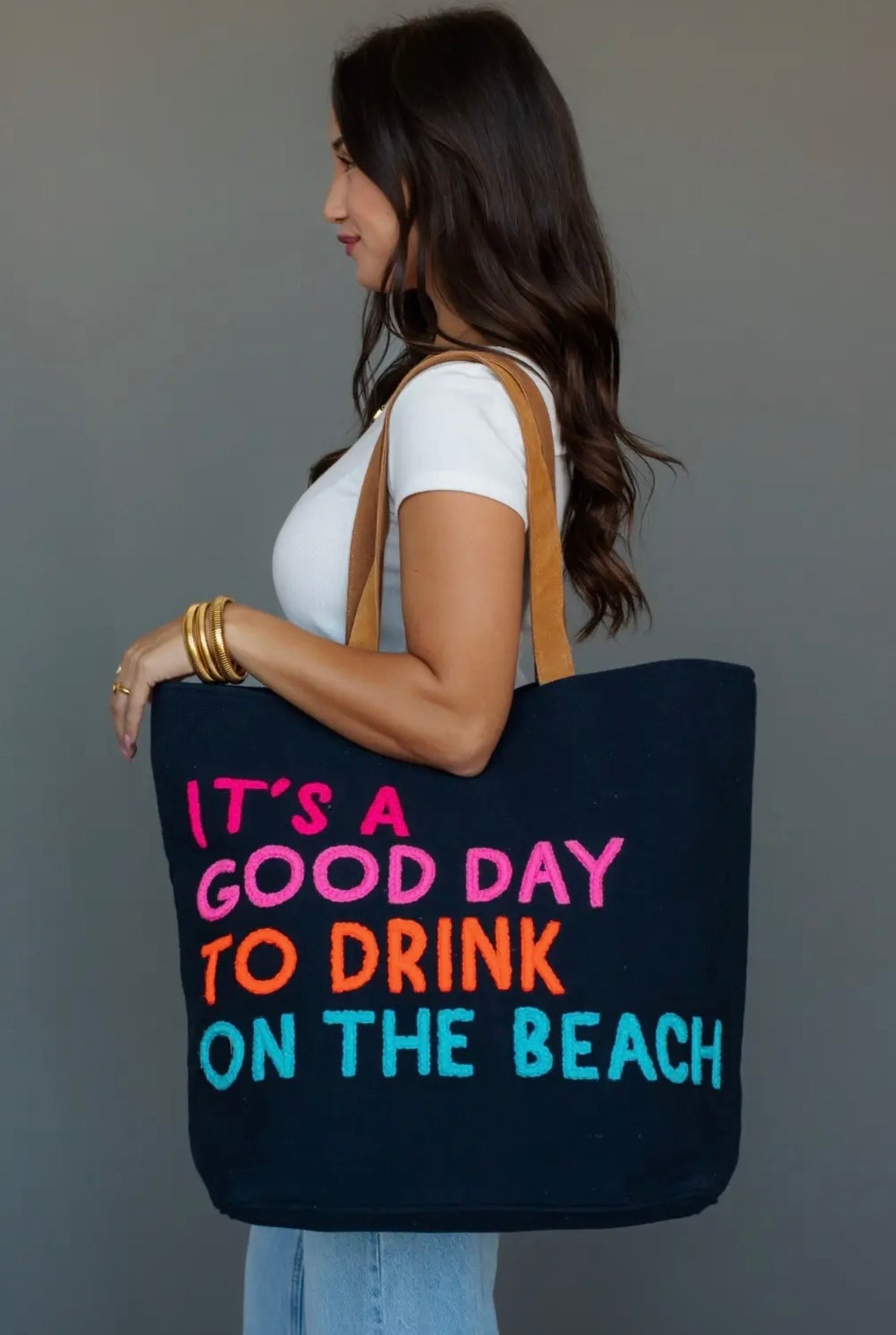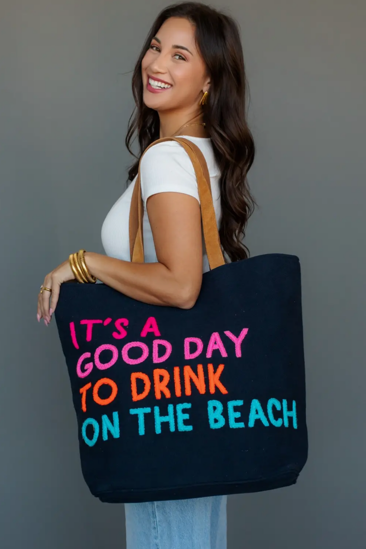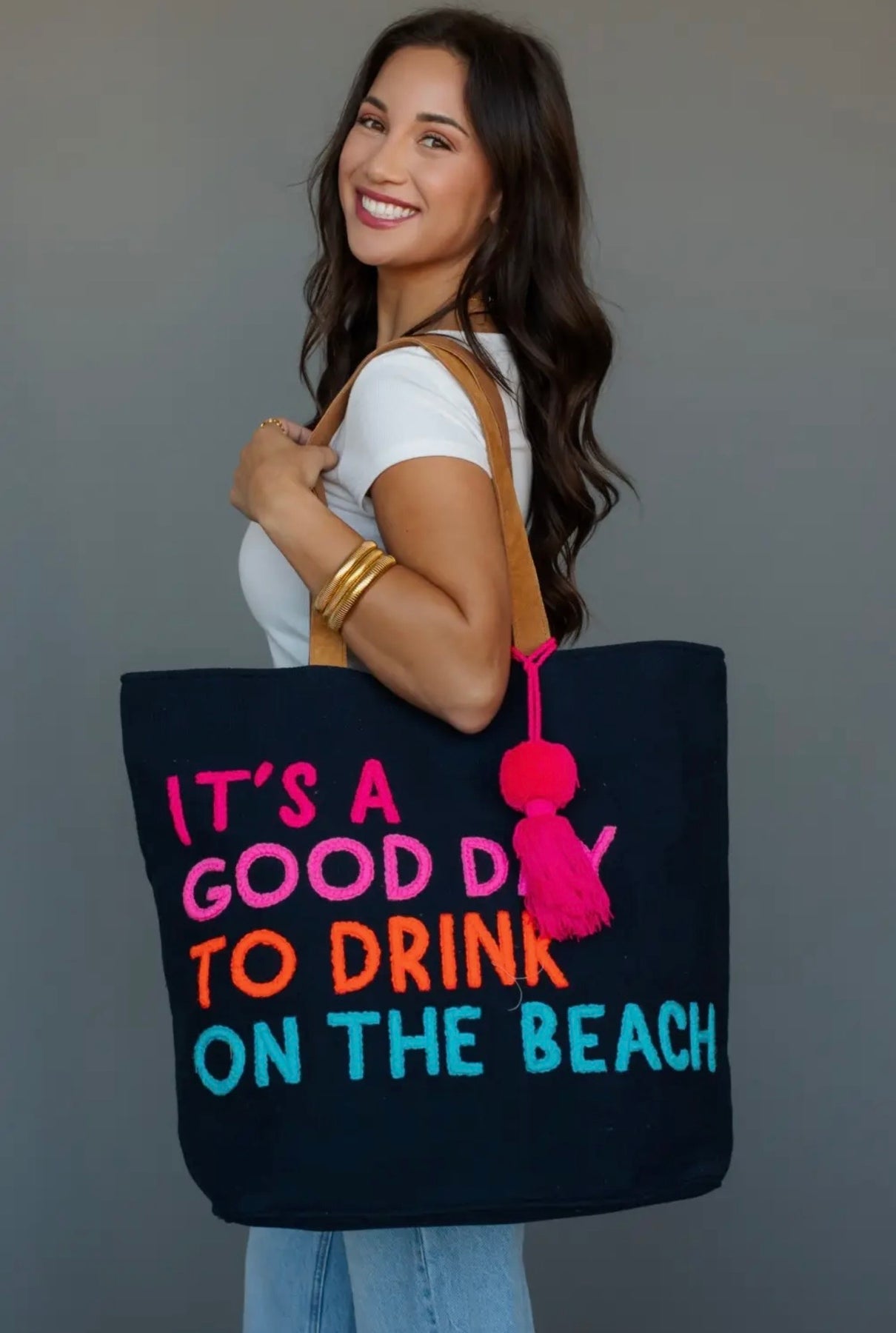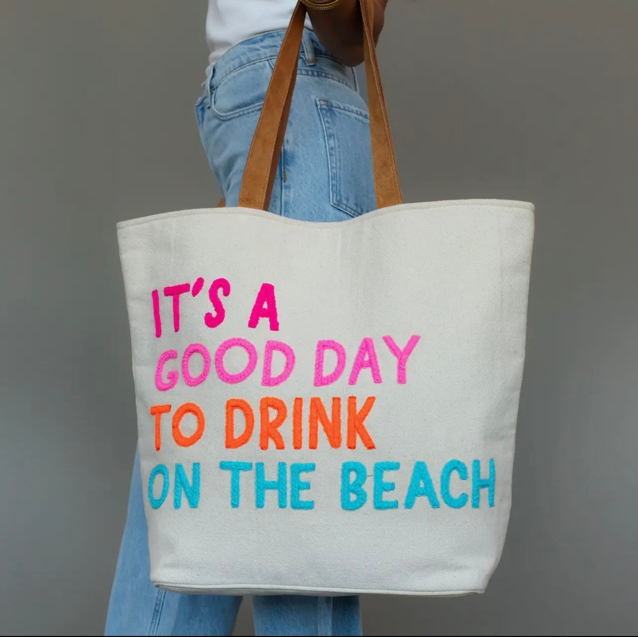 This Beach Tote features multicolored "It's A Good Day To Drink On The Beach" embroidery with tan faux suede handles and a playful pink tassel perfect for sunny beach days or weekend getaways.