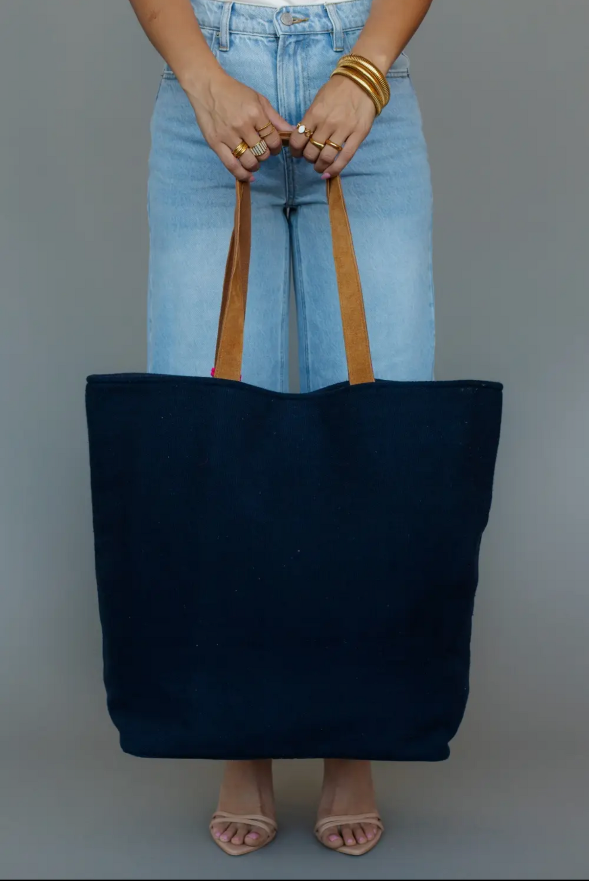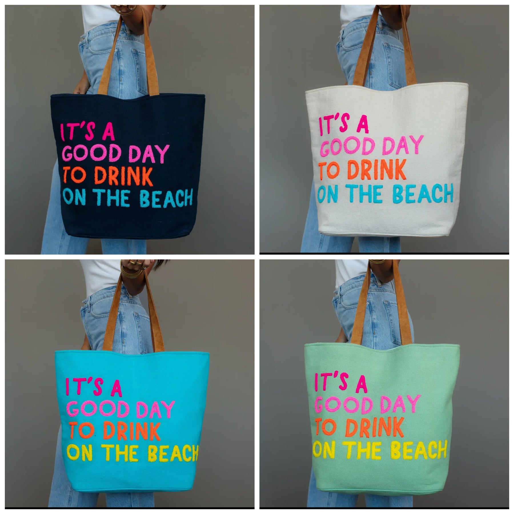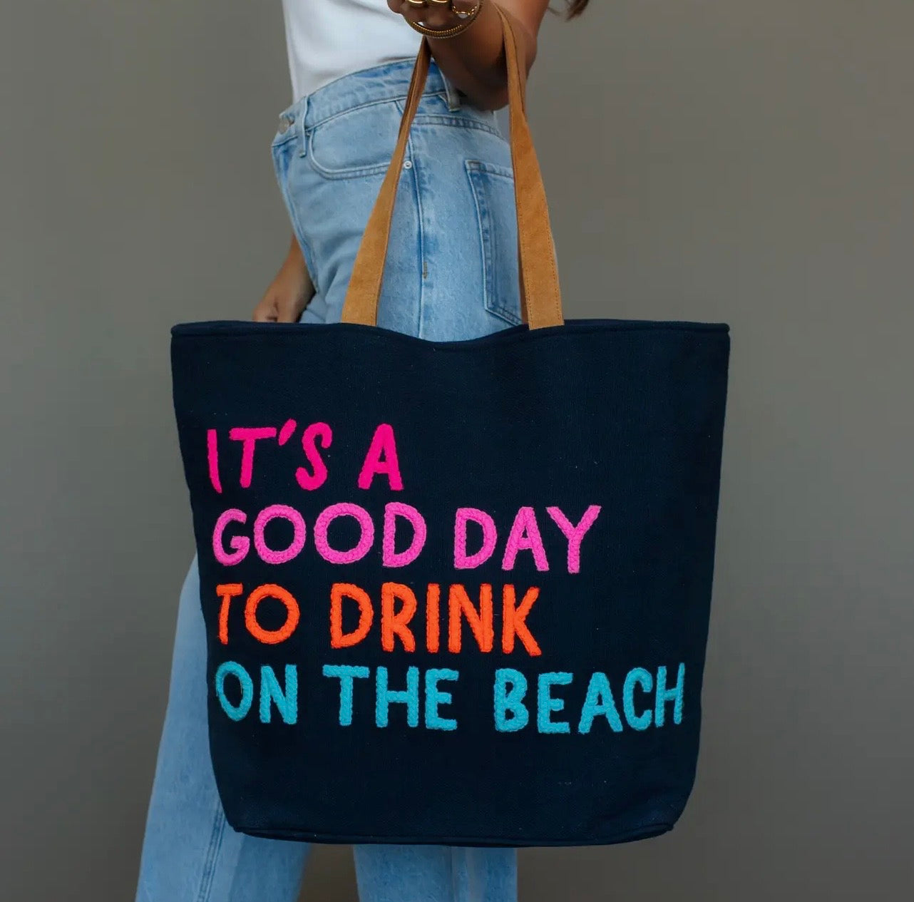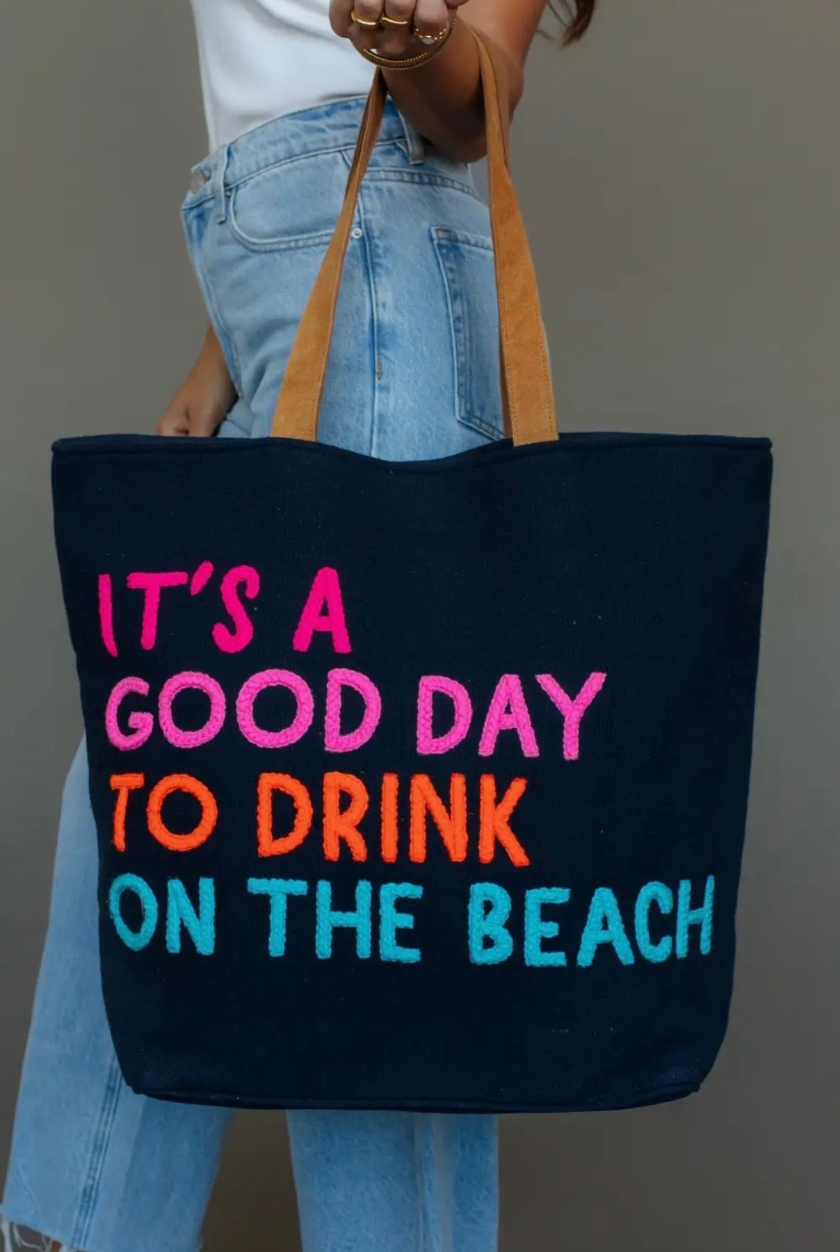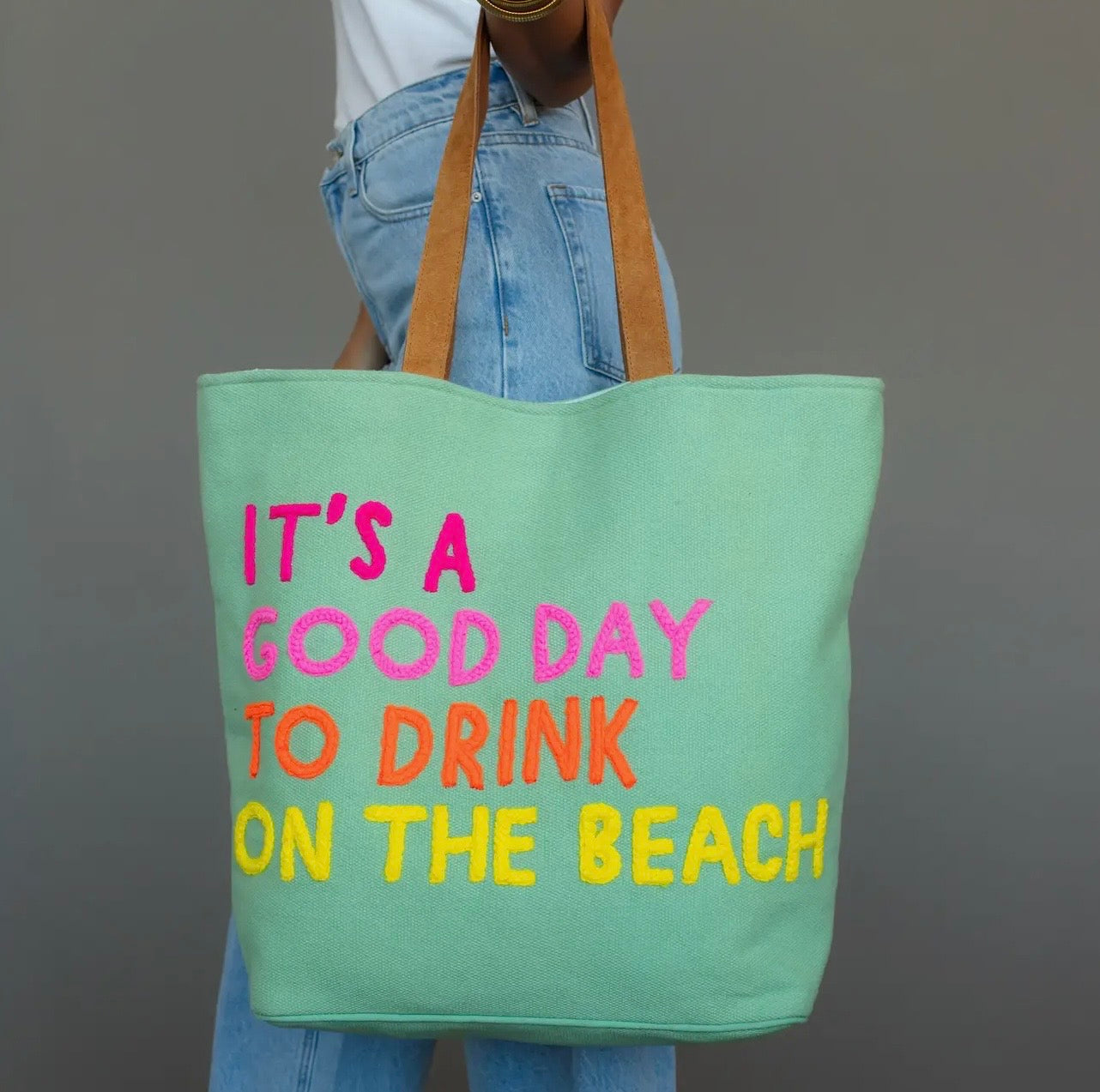 This Beach Tote features multicolored "It's A Good Day To Drink On The Beach" embroidery with tan faux suede handles and a playful pink tassel perfect for sunny beach days or weekend getaways.