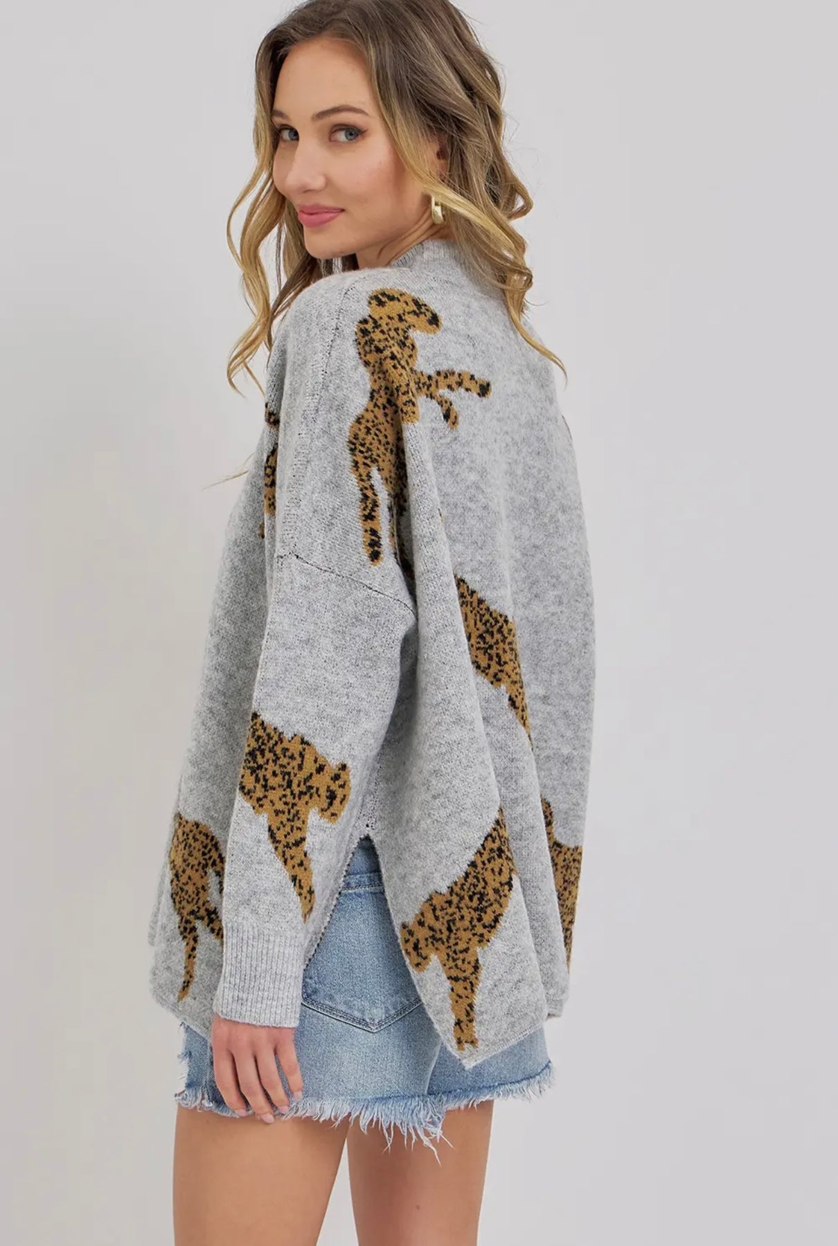 Leopard patterned sweater. This sweater features a mock neckline, dropped shoulders, and oversized fit.