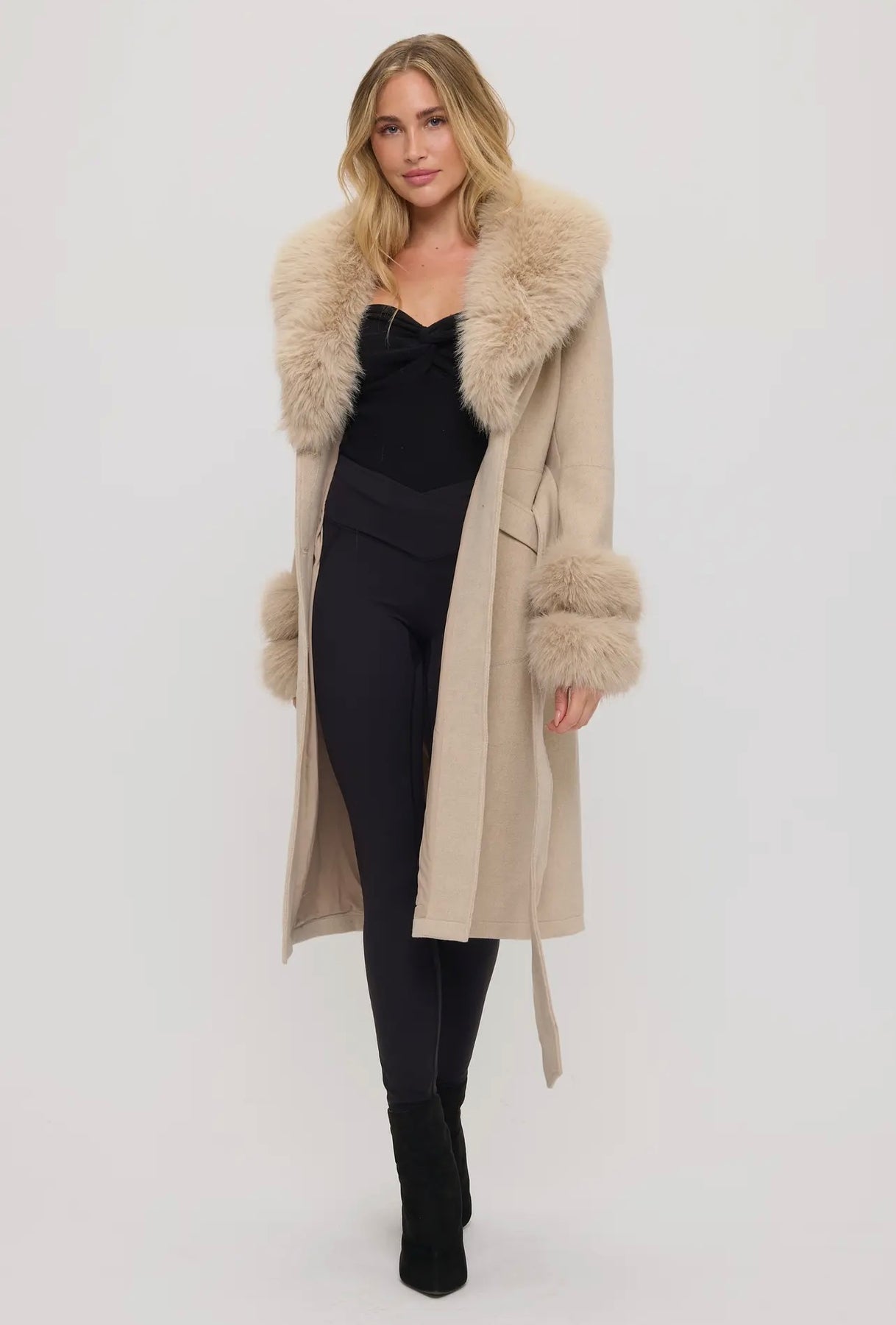 This opulent floor-length coat delivers unparalleled sophistication through its dramatic faux fur collar and coordinating cuff details. The luxurious wool construction creates elegant drape while the oversized fur trim adds instant glamour and exceptional warmth.