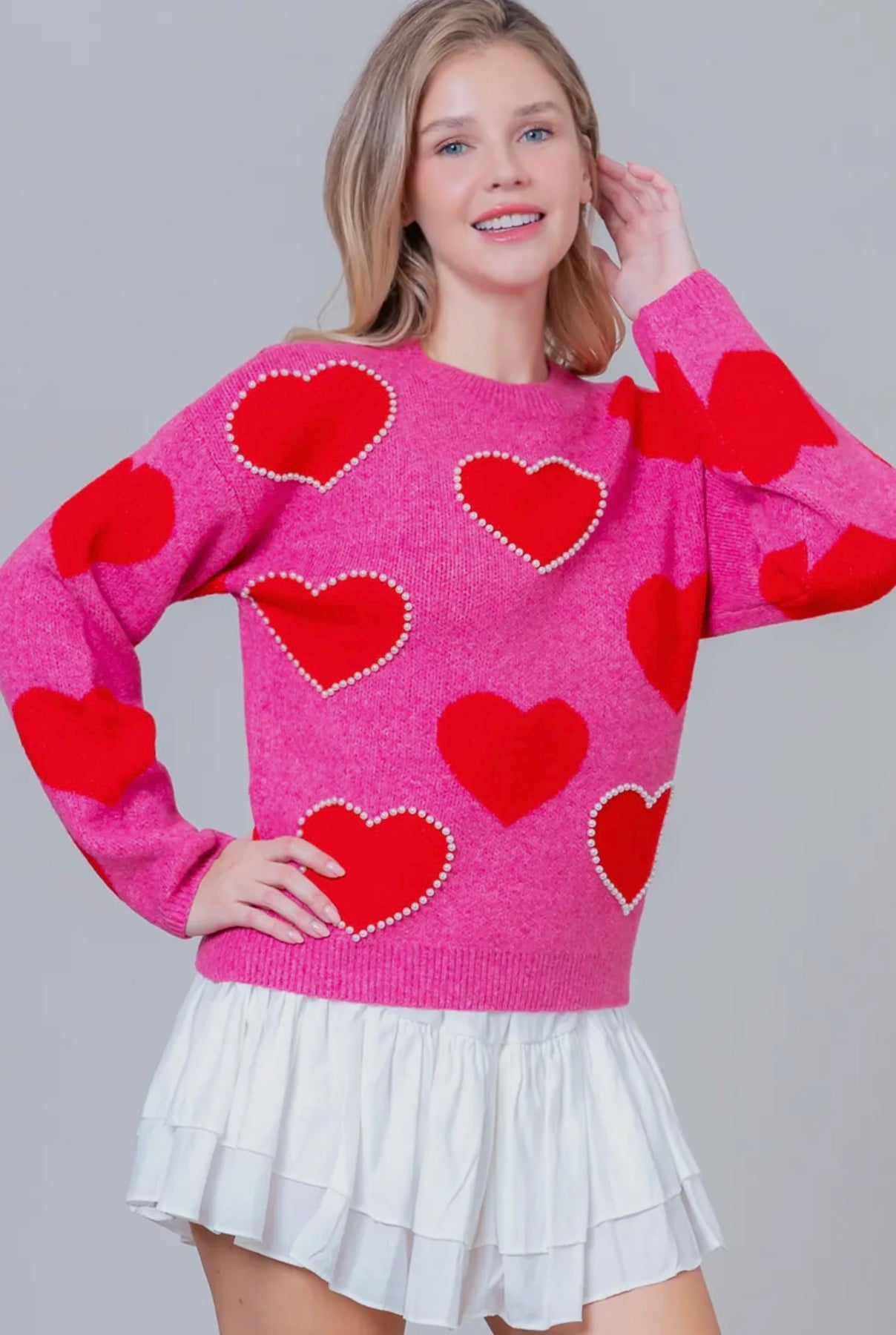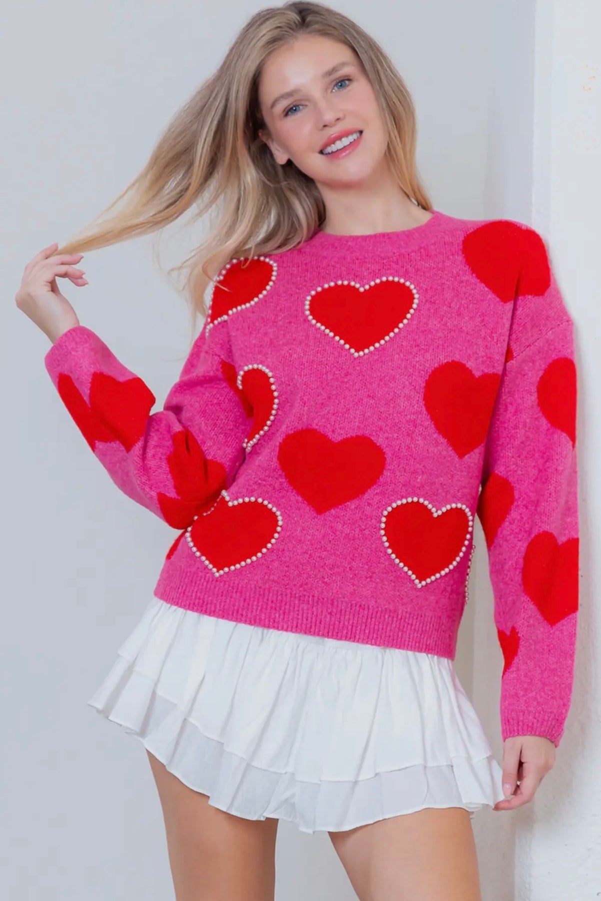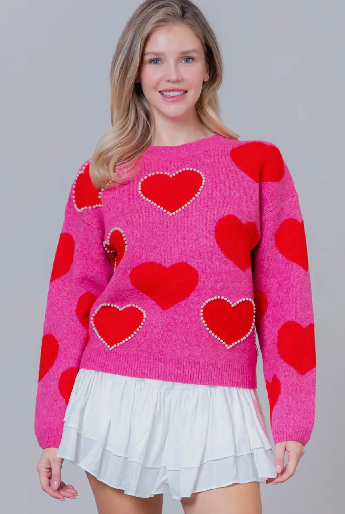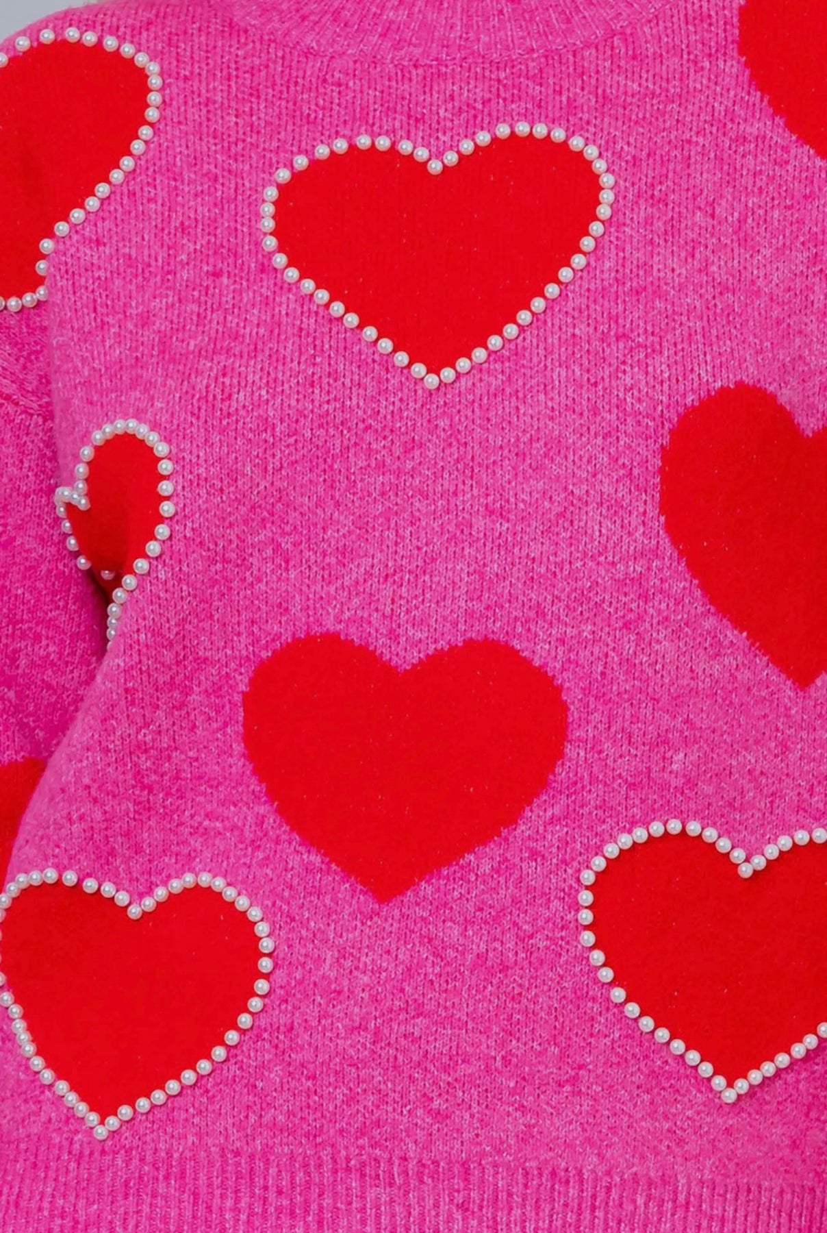 Style: Cozy pink sweater with red hearts & pearl details
