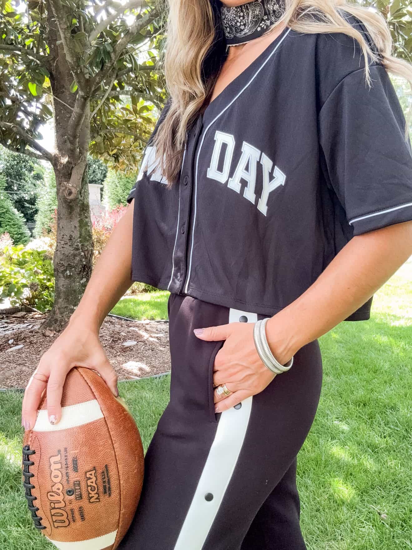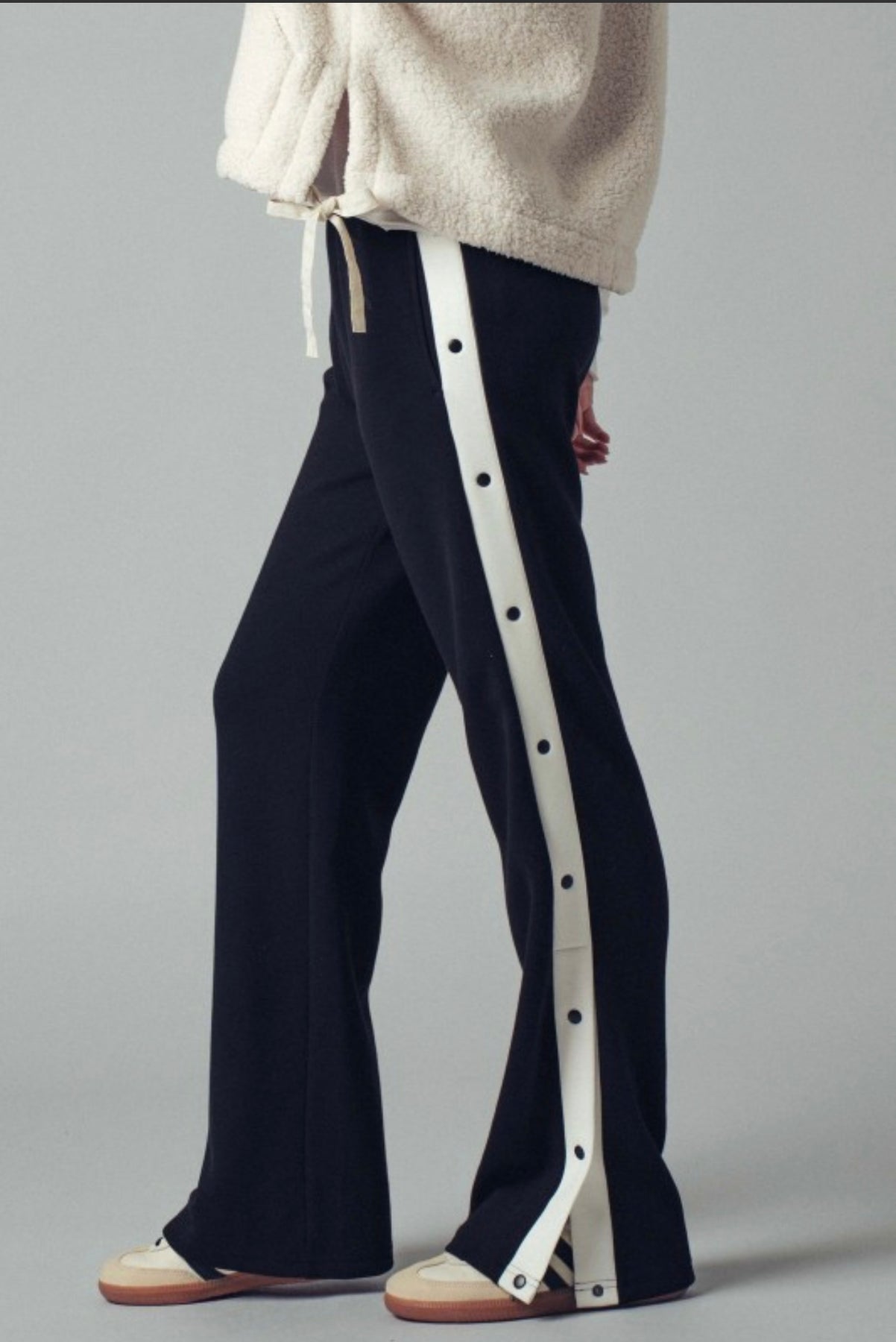 Elevate your casual style with these sporty track pants featuring bold contrast stripes and snap button accents.
